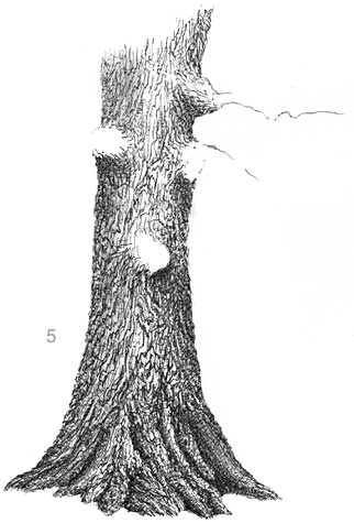 Start at the bottom of the trunk at where the roots come out of the ground. Keeping in mind the shadow areas that will be cast in reference to the light source, add the quick stipple work to the tree trunk work. You won't add stipple work to the whole trunk in every area. Once the stipple work is in you will have a pretty good looking work in progress tree trunk. See images no. 3 and 4: